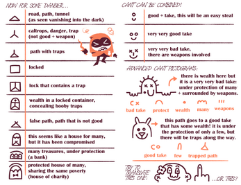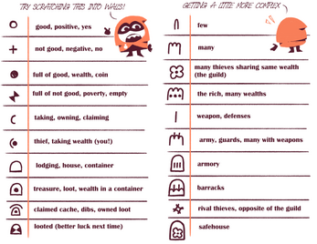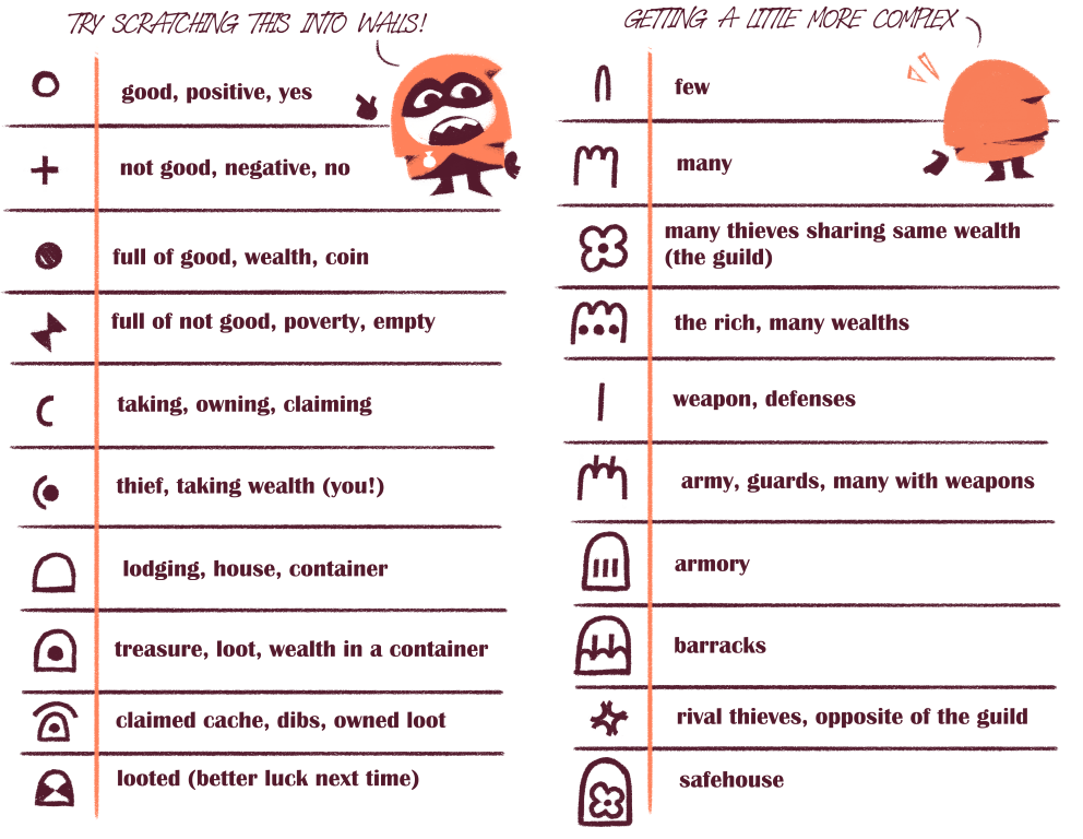 Now, anyone can start to understand the complexities of thieves' cant with this handy guide! Includes 4 pages of introductory glyphs and symbols, examples of use, and advanced pictograms for the daring.